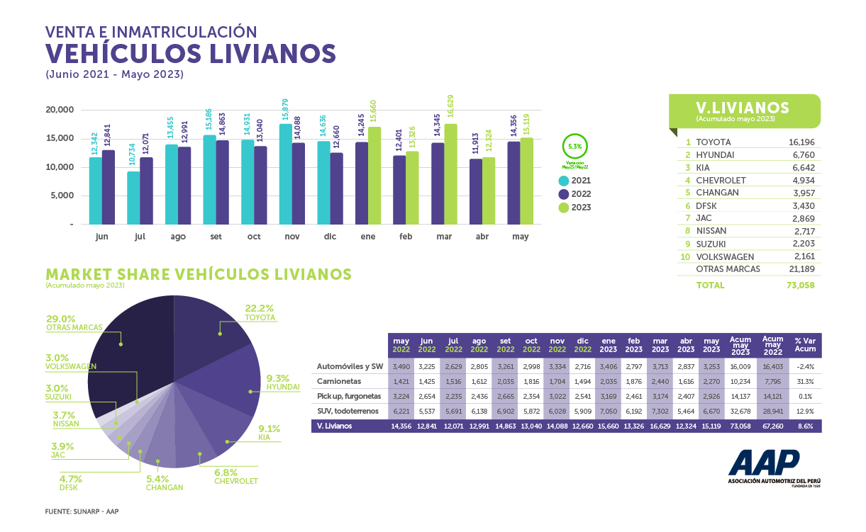 En lo que respecta a la venta e Inmatriculación de vehículos livianos, de mayo 2023 a mayo 2022, se ha determinado un de 5,3% de variación. En ese sentido, quien está liderando las ventas sería Toyota, acumulando un 16.19%, luego estaría Hyundai con 6.76%, Kia con 6.64%, Chrevrolet 4.93%, Changan 3.95%, DFSK 3.43%, JAC 2.86%, Nissan 2.71%, Suzuki 2.20%, Volkswagen 2.16% y otras marcas que representan el 21.18%.