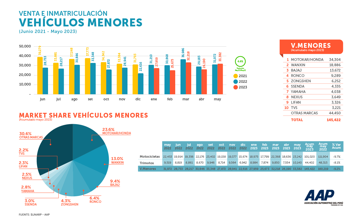 En la venta de vehículos menores, se aprecia una variación de 4.4% en mayo del 2023 a mayo del 2022., posicionandose en la lista Motokar/Honda con 34.30%, siguiéndole Wanxin 18.88%, Bajaj 13.67%, Ronco 9.28%, Zongshen 6.25%, Ssenda 4.33%, Yahama 4.03%, Nexus 3.64%, Lifan 3.32%, TVS 3.22% y otras marcas que representan el 44.45% del total.