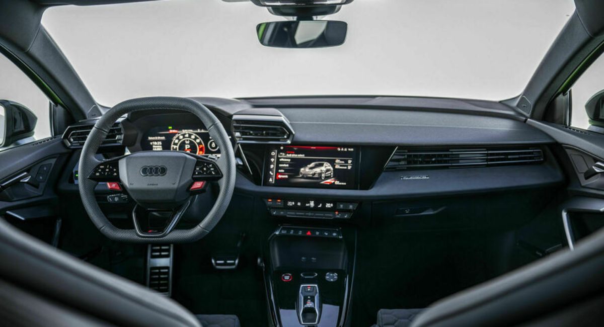 El interior del Audi RS 3 ha sido diseñado para ofrecer una experiencia de conducción centrada en el rendimiento. Los tonos oscuros dominan la cabina, destacando elementos como el nuevo volante deportivo con parte superior e inferior planas y los asientos tipo butaca RS opcionales, que ofrecen un soporte mejorado y están tapizados en una combinación de microfibra Dinamica y cuero napa perlado.