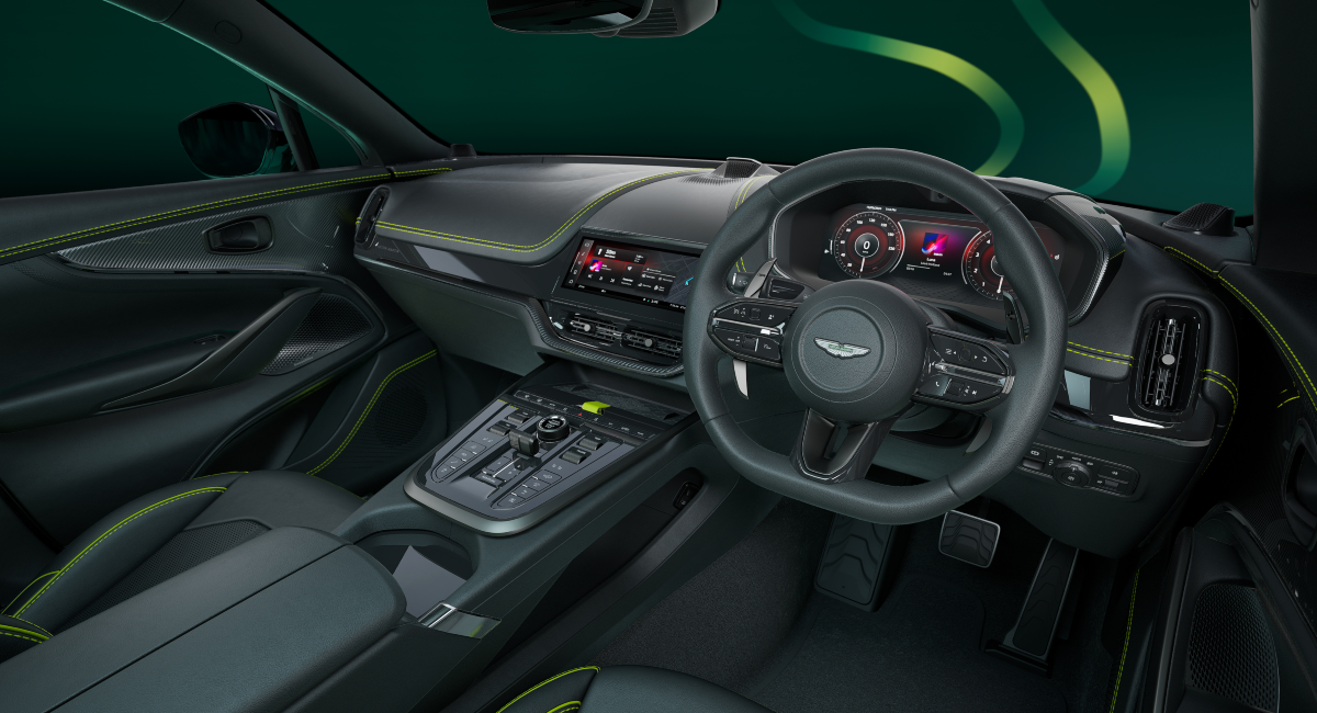 - Elementos Distintivos: Logotipo de Aston Martin en el panel del salpicadero, grabado AMR24 en los umbrales de las puertas, y una correa de sillín cosida a mano en color lima en la estación de carga inalámbrica.