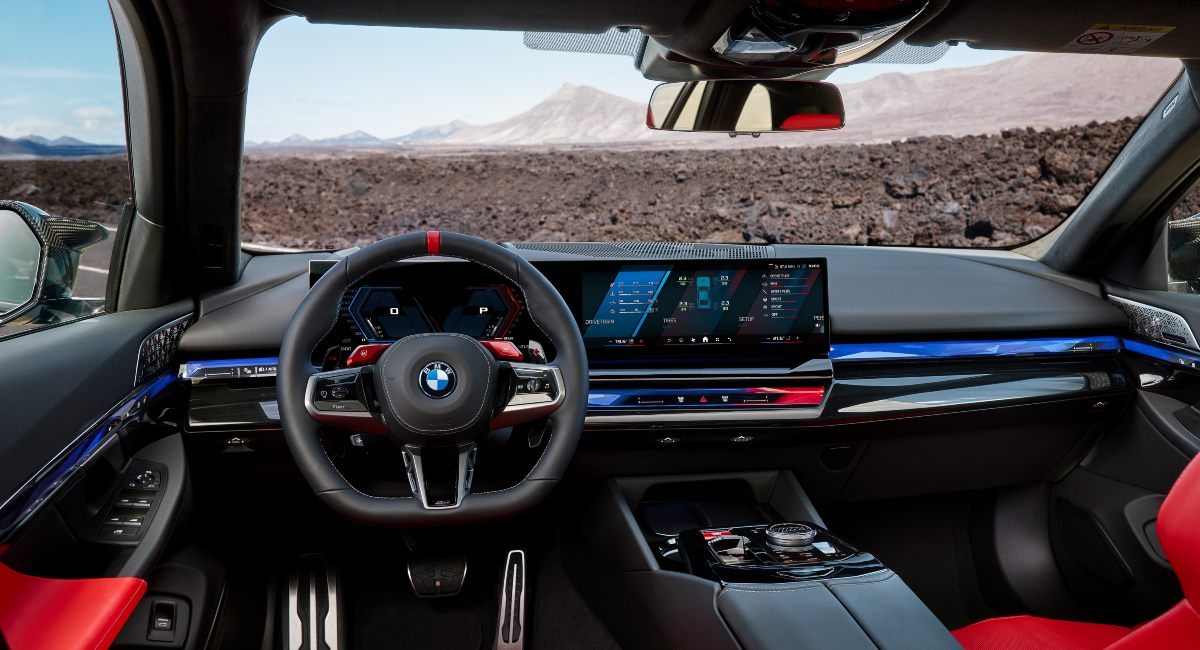 El interior del BMW M5 Touring no se queda atrás en términos de tecnología y confort. El vehículo está equipado con el BMW Curved Display, que ofrece una interfaz moderna y personalizable, y el sistema BMW iDrive 8.5, que permite el control táctil y por voz de las funciones del vehículo. La tapicería de cuero Merino, el climatizador de cuatro zonas y el sistema de sonido envolvente Bowers & Wilkins contribuyen a un ambiente interior lujoso.
