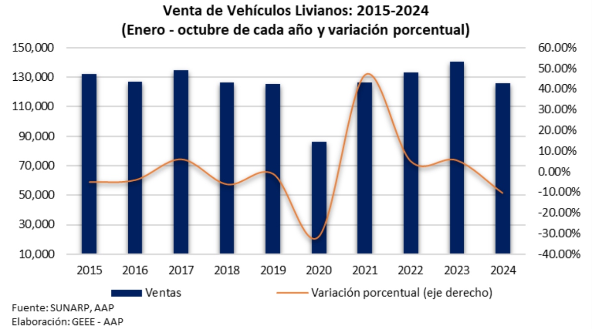 La venta de vehículos livianos nuevos llegó a 13,120 unidades en el décimo mes del 2024, registrando un crecimiento de 3.8% en comparación con similar mes del año pasado, así lo señaló Alberto Morisaki, Gerente de Estudios Económicos y Estadísticas de la Asociación Automotriz del Perú (AAP) tras revisar cifras oficiales de SUNARP y precisar que, durante los primeros diez meses del año, las ventas de dichos vehículos sumaron 126,097 unidades, cifra menor en -10.3% frente a igual periodo del 2023.