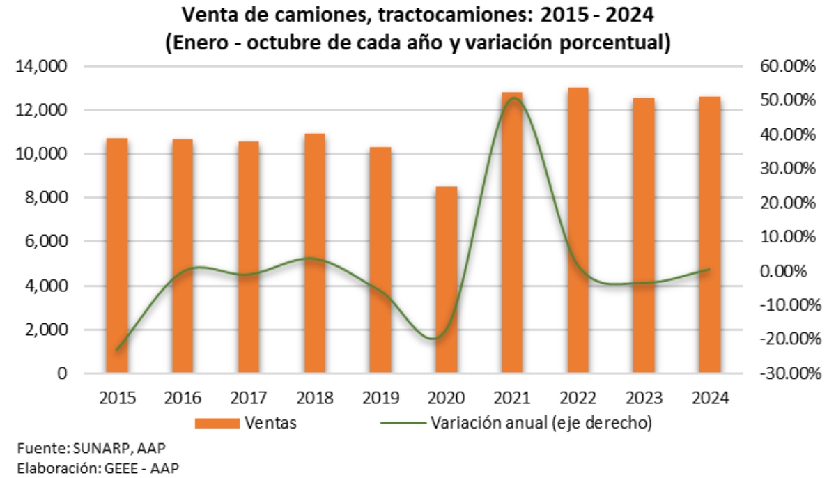 Por otra parte, detalló, dentro del segmento de vehículos pesados, la venta de camiones y tractocamiones sumó 1,244 unidades en octubre del 2024, un retroceso de -9.9% a tasa interanual. En tanto, entre enero y octubre del presente año, la comercializados de los referidos vehículos alcanzó las 12,610 unidades, cifra mayor en 0.4% respecto a similar periodo del 2023. El crecimiento observado en lo que va del año ha sido influenciado por la recuperación de sectores como la construcción, agropecuario, industria manufacturera, entre otros, así como la continuación del buen desempeño del sector minero, quien en conjunto demandan intensivamente el uso de los referidos vehículos, principalmente de los tractocamiones y camiones de mayor tonelaje, mientras que los más pequeños mostraron un desempeño tímido debido a que las actividades ligadas al comercio no han repuntado con la fuerza esperada.
