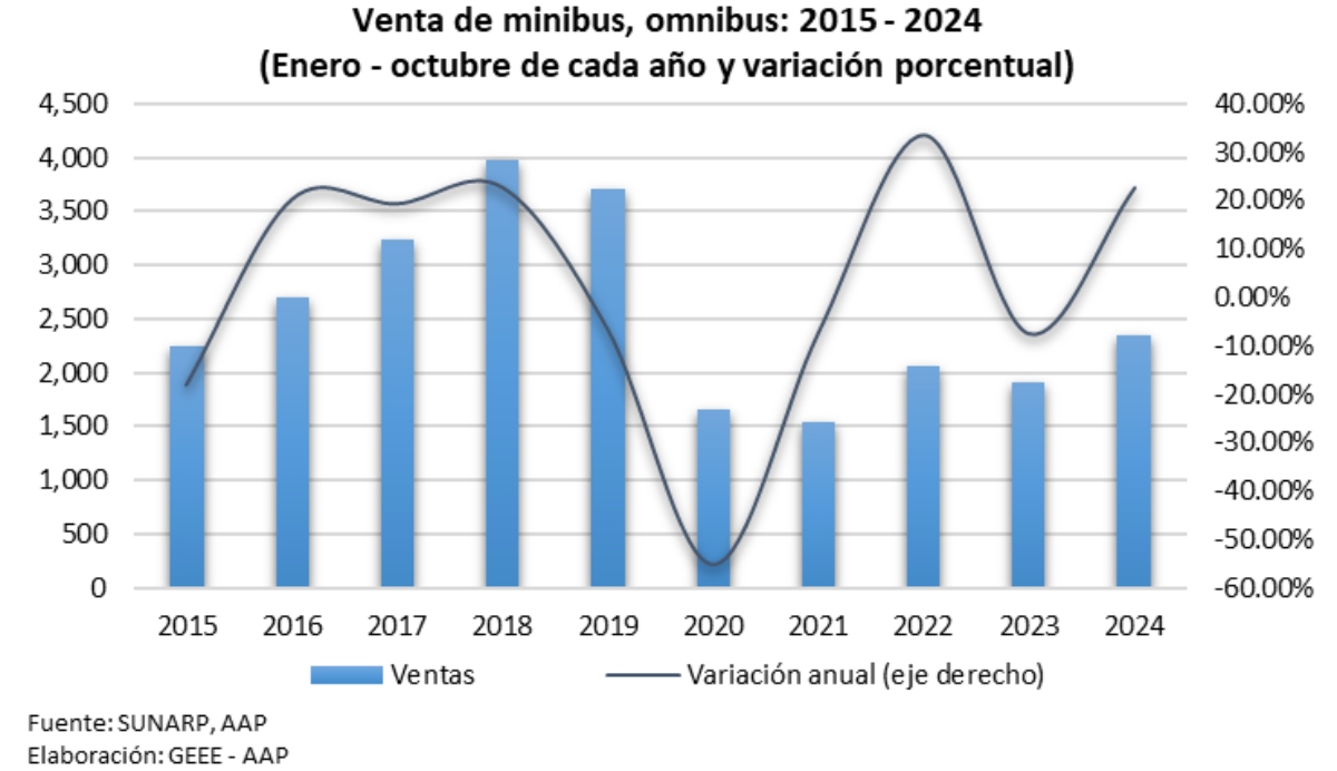 Por otra parte, detalló, dentro del segmento de vehículos pesados, la venta de camiones y tractocamiones sumó 1,244 uDel mismo modo, la venta de minibús y ómnibus mantuvo su tendencia ascendente y reportó 256 unidades vendidas en octubre último, superando en 21.3% el registro de igual mes del 2023. Igualmente, entre enero y octubre del 2024, la comercialización de dichos vehículos avanzó a 2,348 unidades, alcanzando un incremento de 22.7% en relación a similar lapso del año pasado. La considerable expansión en las ventas de dichos vehículos se explica por el repunte de actividades económicas como el transporte de personas, así como las ligadas al turismo, en un contexto en el cual no se han sufrido eventos que dificulten la normal circulación de vehículos, como sucedió durante la pandemia, las protestas sociales de finales del 2022 e inicios del 2023, así como fenómenos climatológicos como el ciclón Yaku que también azotó al país durante el año pasado.