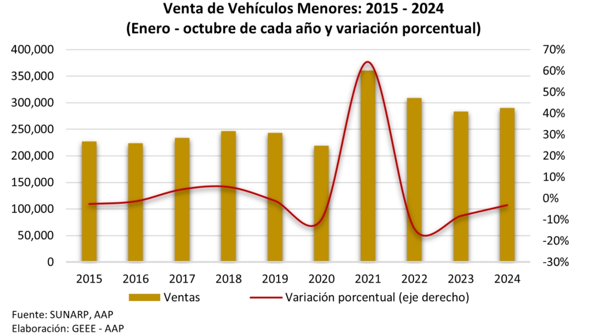 Finalmente, las ventas de vehículos menores totalizaron 31,699 unidades en octubre del presente año, cifra que estuvo 23% por encima de lo registrado durante el mismo mes del 2023. Por su parte, en los primeros diez meses del 2024, las ventas de los referidos vehículos sumaron 289,937 unidades, reportando un incremento de 2.2% a tasa anual. De manera desagregada, se observó que, en el periodo analizado, las ventas de motocicletas totalizaron 203,643 unidades (+3.0%) y la de trimotos fue 86,294 unidades (+0.3%). Tras un par de años de descensos, la venta de vehículos menores viene mostrando una expansión durante el 2024, lo que sugiere que el proceso de normalización de la demanda habría terminado, a lo que se le habría aunado la renovación de las unidades que se adquirieron años anteriores, además de las compras realizadas por instituciones públicas.