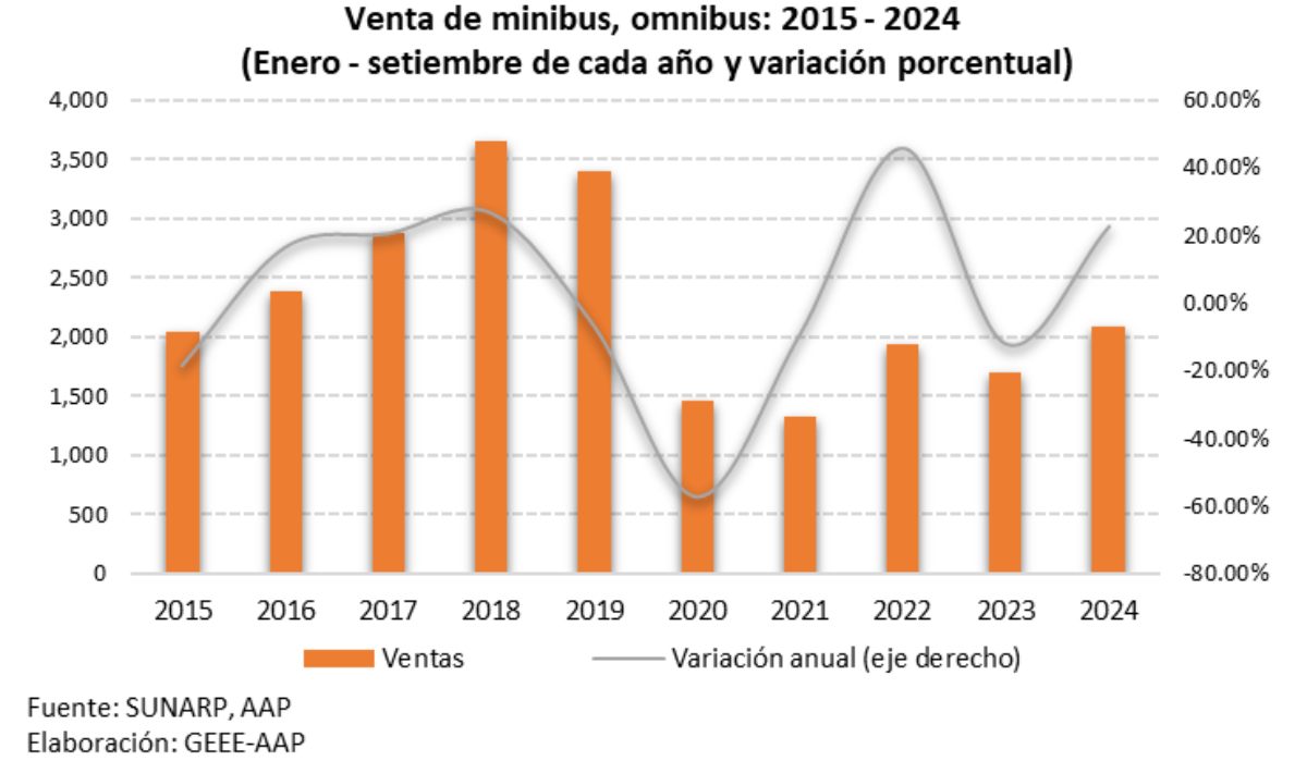 De igual manera, la venta de minibús y ómnibus viene mostrando un desempeño positivo, ya que en setiembre último las ventas de dichos vehículos sumaron 280 unidades, obteniendo un avance de 64.7% a ritmo interanual. Asimismo, entre enero y setiembre del 2024, la comercialización de los referidos vehículos se situó en 2,092 unidades, es decir 22.9% más que en el mismo periodo del 2023. El significativo crecimiento de la comercialización de dichos vehículos continuó explicándose por el mayor dinamismo anotado por actividades como el transporte de personas, principalmente interprovincial, y turismo, que tras varios años en donde enfrentaron shocks negativo (pandemia, conflictos sociales, eventos climatológicos), en este 2024 han conseguido desempeñarse con normalidad.
