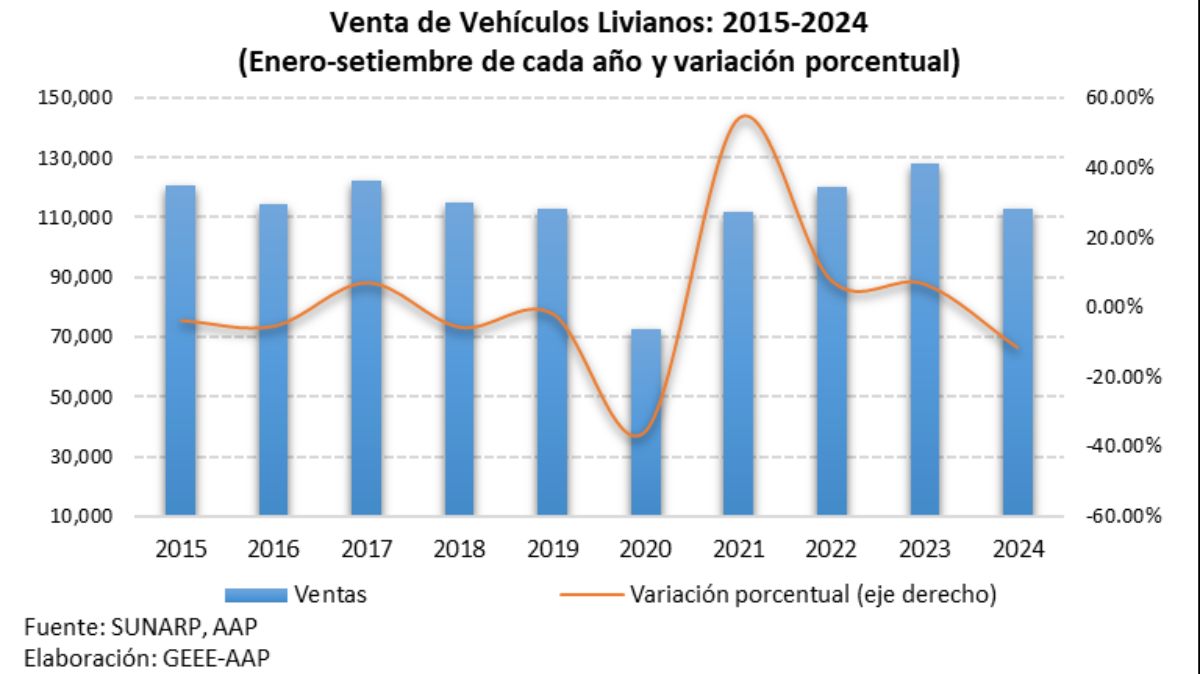 Añadió que, de acuerdo a cifras oficiales de SUNARP, la venta de vehículos livianos nuevos totalizó 13,618 unidades en setiembre del presente año, y alcanzó un incremento de 3.2% respecto a similar mes del 2023, obteniendo su tercer mejor resultado en el año. En tanto, entre enero y setiembre del 2024, las ventas acumuladas de dichos vehículos sumaron 112,977 unidades, cifra inferior en -11.7% respecto a similar periodo del año pasado. Si se desagrega la información, se observa que las ventas de SUV llegaron a 54,648 unidades en el periodo analizado, retrocediendo en -5.4% a tasa anual. Por su parte, las ventas de pick up y furgonetas se situaron en 22,058 unidades (-11.4%), las de automóviles fue 20,695 unidades (-23.4%) y la de camionetas disminuyó a 15,576 unidades (-14.5%).