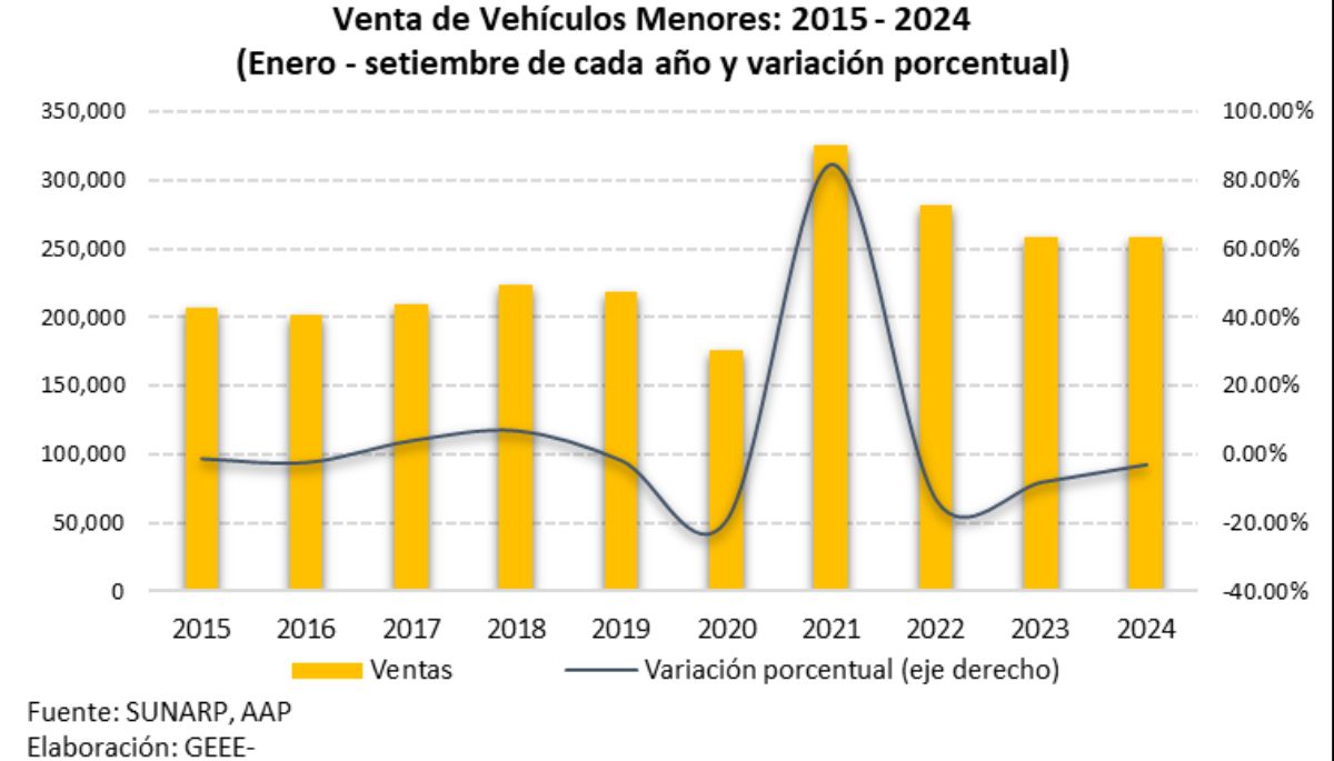 Por último, resaltó el vocero gremial, las ventas de vehículos menores sumaron 33,615 unidades en el noveno mes del 2024, y anotó un crecimiento de 19.2% a tasa interanual, su mayor expansión porcentual del presente año. En tanto, entre enero y setiembre último, las ventas acumuladas de dichos vehículos sumaron 258,238 unidades, cifra superior en 0.1% respecto igual lapso del 2023. Por tipo de vehículo, se observa que las ventas de motos llegaron a 181,590 unidades (+0.9%) y la de trimotos fue 76,648 unidades (-1.6%). La venta de vehículos menores ha venido anotando una recuperación paulatina durante el 2024, lo que nos indicaría que el proceso de normalización de la demanda que experimentó durante el 2022 y 2023 estaría llegando a su fin en este año, se viene dando la renovación de unidades de parte de las personas, y renovación y compra de flotas de parte de instituciones públicas.