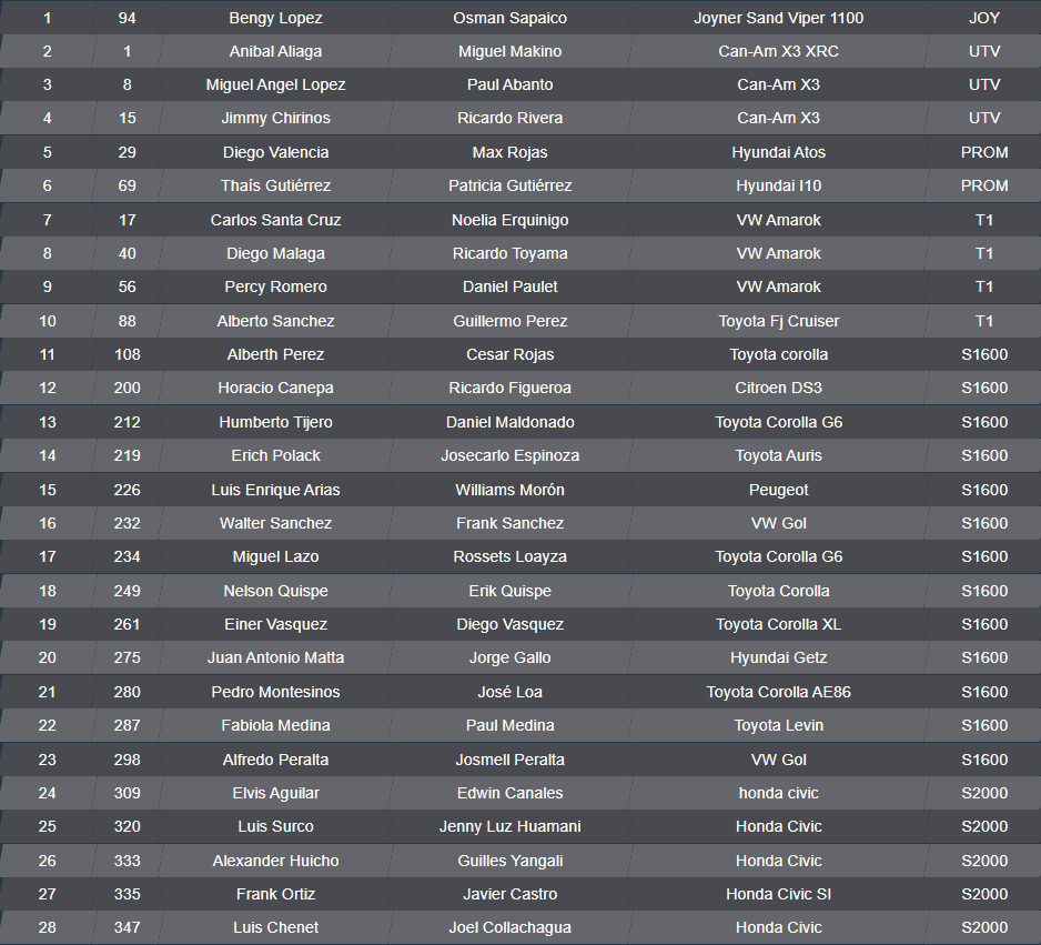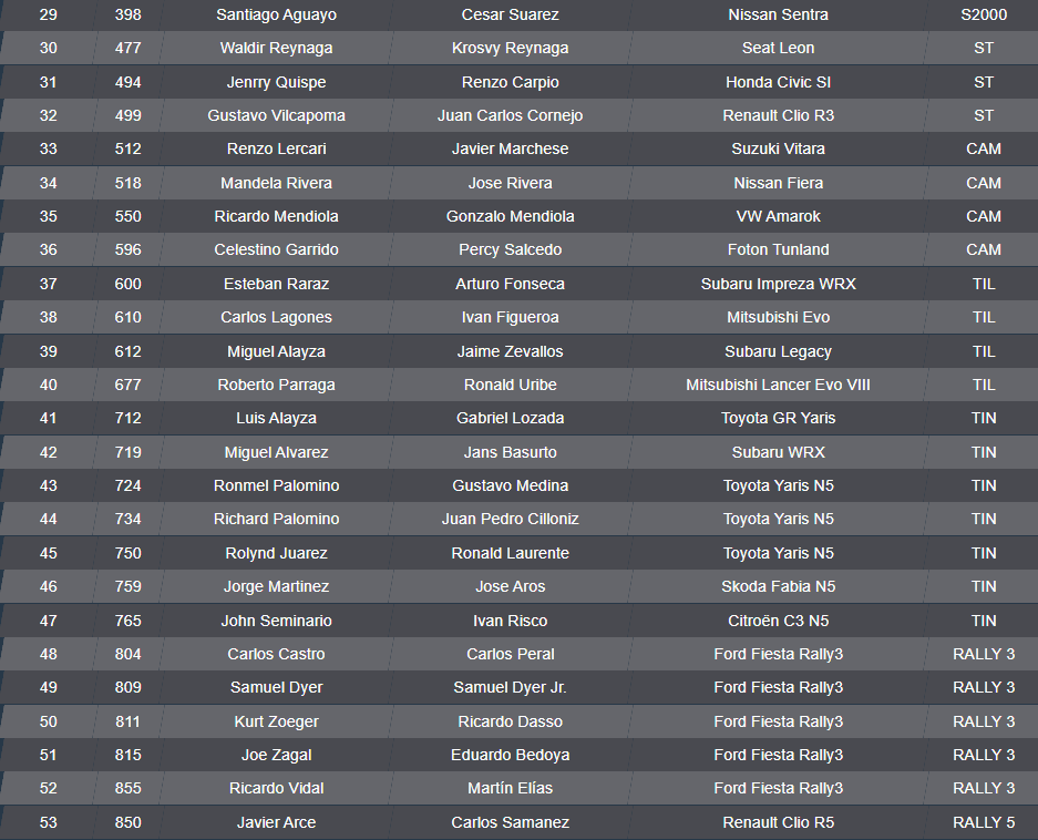 En la categoría ST solo hay tres tripulaciones inscritas, entre ellas la de Waldir y Krosvy Reynaga; en la categoría Camionetas tenemos a Renzo Lercari y Javier Marchese, además de Mandela y José Rivera; en la categoría Tracción Integral Light uno de los binomios favoritos es Roberto Párraga y Ronald Uribe; mientras que en la categoría Tracción Integral Nacional están Luis Alayza y Gabriel Lozada, Richard Palomino con Juan Pedro Cilloniz y Ronmel Palomino con Gustavo Medina; en la categoría Rally3 tenemos a Carlos Castro y Carlos Peral; en la categoría UTV encontramos a Aníbal Aliaga y Miguel Makino; en la categoría T1 están Diego Málaga y Ricardo Toyama; en la S1600 tenemos a Walter y Frank Sánchez, Nelson y Erik Quispe; y Fabiola y Paul Medina. Finalmente, en la categoría S2000 tenemos entre las tripulaciones favoritas a Elvis Aguilar y Edwin Canales, Luis Surco y Jenny Luz Huamaní, y Frank Ortiz con Javier Castro.