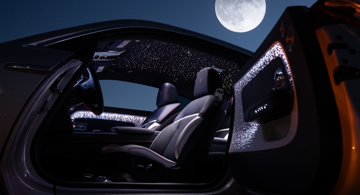 El interior del Spectre Lunaflair también refleja la atención al detalle y la personalización que caracteriza a Rolls-Royce. Los tonos de azul marino, blanco y rosa peonía evocan el espectro de matices observados durante un halo lunar. Esta combinación de colores se manifiesta en los asientos, las puertas y el tapizado del techo Starlight, creando un ambiente lujoso y armonioso. Además, el volante de dos tonos, con un exterior azul marino y un interior blanco ártico, complementa perfectamente el diseño del interior.