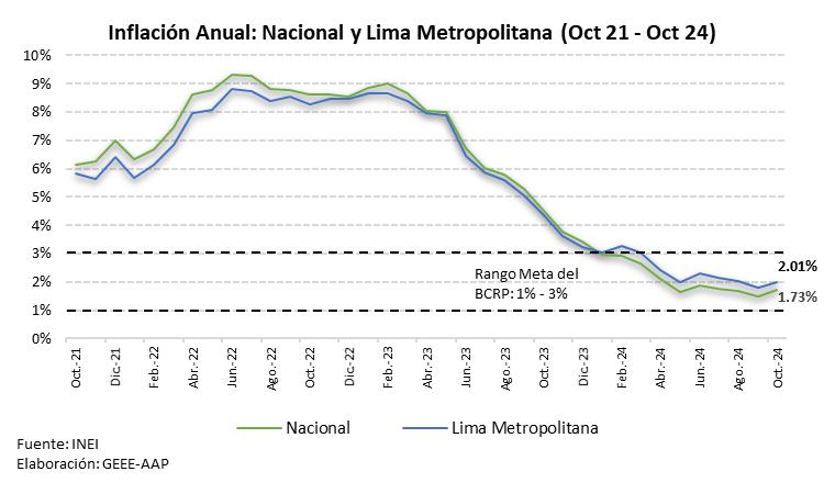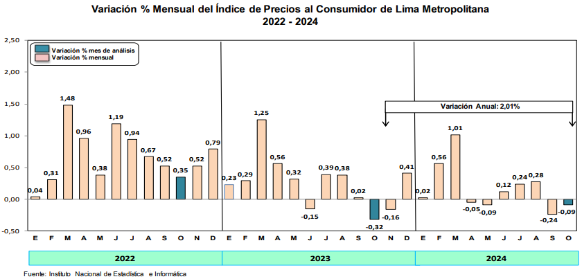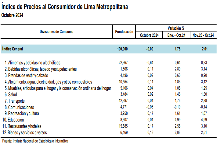De acuerdo con los datos del Instituto Nacional de Estadística e Informática (INEI), el índice de precios al consumidor de Lima Metropolitana registró una caída de -0.09% en octubre de 2024 a tasa mensual, un descenso por debajo de lo esperado por el mercado (0.02%). A nivel acumulado, entre enero y octubre de 2024, la inflación llegó a 1.76%, mientras que en los últimos 12 meses la variación del índice de precios fue de 2.01%, posicionándose en el centro del rango meta del BCRP, que se encuentra entre 1% y 3%.