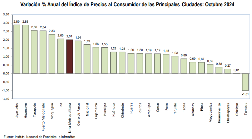 De igual manera, respecto al índice de precios de las principales ciudades del Perú, durante octubre del presente año la ciudad que reportó un mayor nivel de inflación anual fue Ayacucho con una variación anual de 2.89%, seguida por Huancayo con 2.88%, Tarapoto con 2.56%, Puerto Maldonado con 2.54% e Moquegua con 2.33%. Asimismo, las ciudades con menor inflación fueron Chachapoyas con 0.27%, Chiclayo con 0.01% y Tumbes con -1.01%.