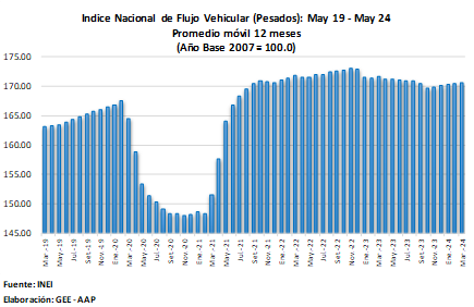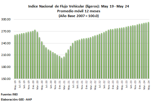Tras explicar que dicho resultado se debe al aumento de la circulación de vehículos livianos, el cual avanzó en 4.7% a tasa anual, mientras que el tránsito de vehículos pesados lo hizo en 8.6% en similar periodo de comparación. Por su parte, el índice nacional anotó un crecimiento de 3.2% durante junio’23 – may’24 en comparación con igual lapso de un año atrás.