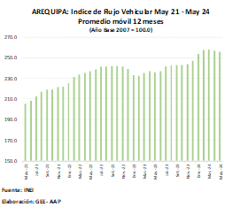 De otro lado, al analizar el comportamiento de la circulación vehicular por regiones, se observa que en Arequipa el movimiento vehicular se redujo en 6.8% por los trabajos de mantenimiento periódico para reestablecer el tránsito de la carretera Arequipa-Yura. Asimismo, en Junín, el flujo vehicular total se redujo en 4,7%, afectado por el bloqueo de la carretera Marginal por los deslizamientos de lodo y piedras, ante la ocurrencia de lluvias torrenciales en el sector de Villa Progreso, en la provincia de Chanchamayo; mientras que en La Libertad la circulación disminuyó en 0.8%, debido al bloqueo de vías en las provincias de Pataz y Sánchez Carrión por parte de pobladores de ambas jurisdicciones, impidiendo el tránsito de camiones y buses.