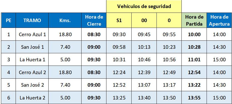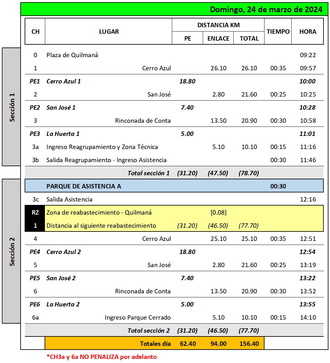 La largada protocolar está programada para el domingo 24 de marzo a las 9:30 de la mañana en la Plaza de Quilmaná. La partida del primer especial será a las 10:00 de la mañana en Cerro Azul y contará con 6 pruebas especiales con una distancia total de 62.40 kilómetros de competencia y 94 kilómetros de enlaces, haciendo un total de 156.40 kilómetros de recorrido.