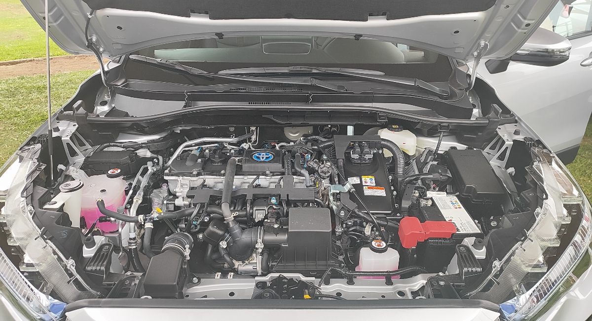La configuración motriz no ha variado en este Corolla Cross HEV, mantiene la cuarta generación del sistema híbrido de Toyota, encontramos dos motores, uno gasolinero y otro eléctrico que trabajan bajo el ciclo Atkinson, la caja es e-CVT y la batería es de alta tensión (1.3 kwh), hay también un inversor que es un componente que tiene la responsabilidad de aumentar el voltaje de 200 a 600 voltios. El motor es de 1.8 litros y la potencia combinada es de 120.7 caballos, además el torque es de 16.6 kgm. Sobre la batería, señalar que no debe llegar a 100% porque se calienta, ni debe bajar a 20% porque no es recomendable, debe dura alrededor del 80%. Esta batería tiene una refrigeración forzada por aire, para el mantenimiento se debe cambiar el filtro de aire. Esta batería no tiene un tiempo establecido de vida. A 20 mil kms se debe cambiar el filtro de aire.