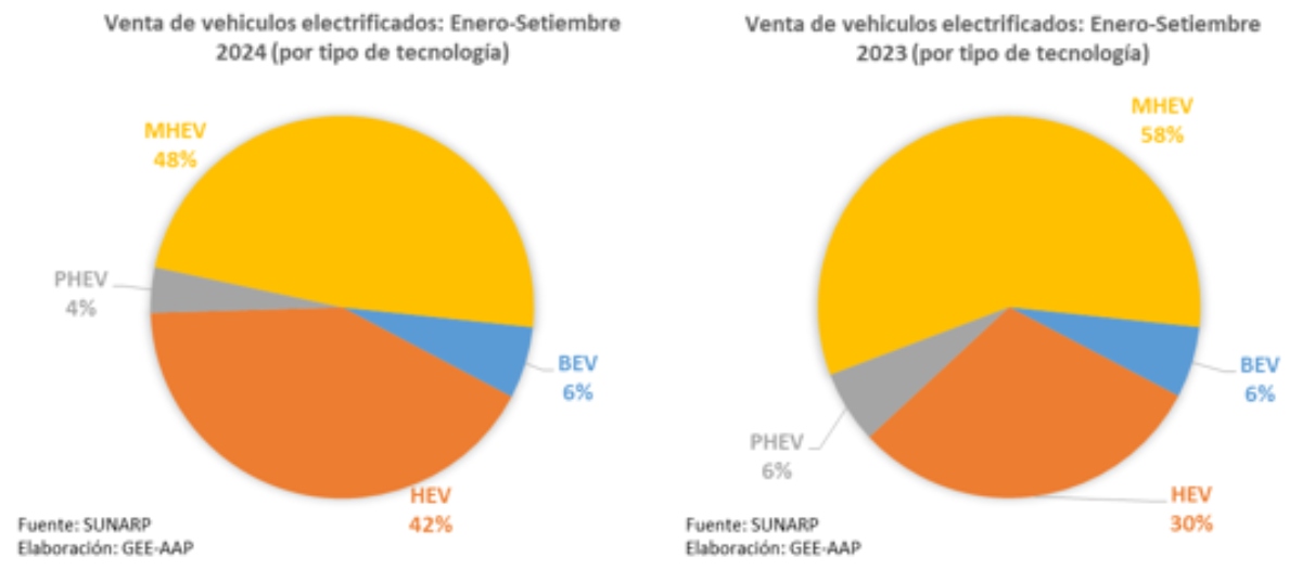 Al desagregar la información de acuerdo al tipo de tecnología, se puede notar que en el periodo de análisis los vehículos electrificados más comercializados fueron los híbridos ligeros o MHEV (Mild Hybrid Electric Vehicle, por sus siglas en inglés) con 2,420 unidades (+31.2%), seguido de los híbridos convencionales o HEV (Hybrid Electric Vehicle) con 2,093 unidades (+114.7%). Luego se situaron los eléctricos puros o BEV (Battery Electric Vehicle) con 305 unidades (+57.2%) y los híbridos enchufables o PHEV (Plug-in Hybrid Electric Vehicle) con 192 unidades (-3%). “Al presentar la participación porcentual por clase de tecnología, destaca el liderazgo de los híbridos ligeros, los cuales tienen una mayor preferencia entre los consumidores, con una participación de 48% dentro de las ventas en los primeros nueve meses del 2024. En tanto, la participación de los híbridos convencionales se ubicó en 42%; mientras que los eléctricos puros se situaron en 6%, y los híbridos enchufables llegaron a 4%”, destacó el vocero de la AAP.