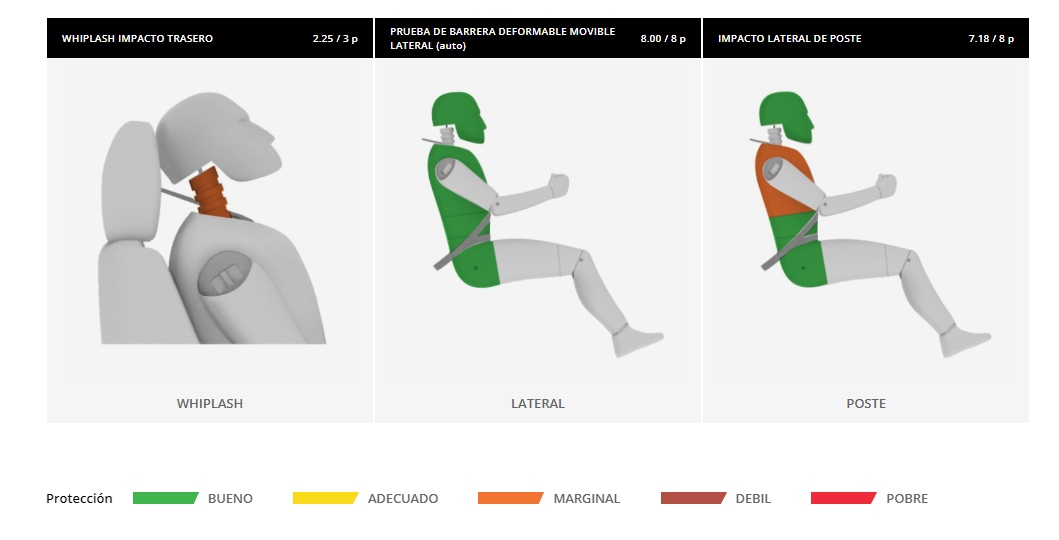 En el impacto lateral, las zonas de la cabeza, abdomen, pecho y pelvis también recibieron protección buena, destacando la eficacia de los sistemas de seguridad pasiva del vehículo. Sin embargo, en el impacto lateral contra un poste, el pecho recibió protección marginal, lo que sugiere que esta área es más vulnerable en situaciones de mayor gravedad.